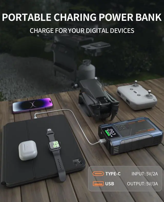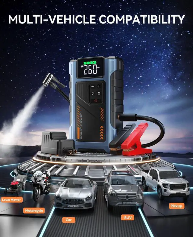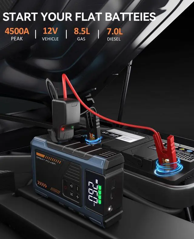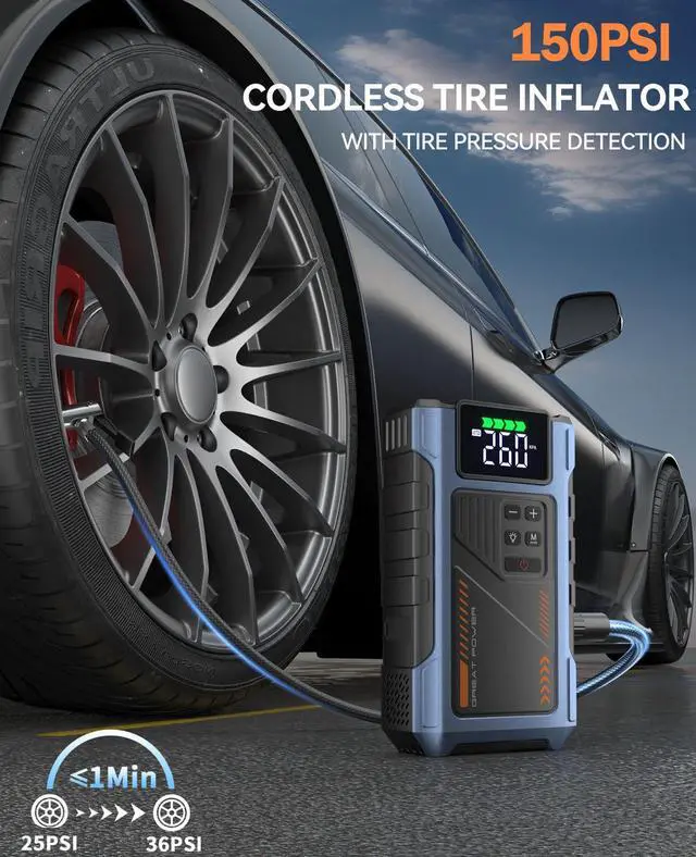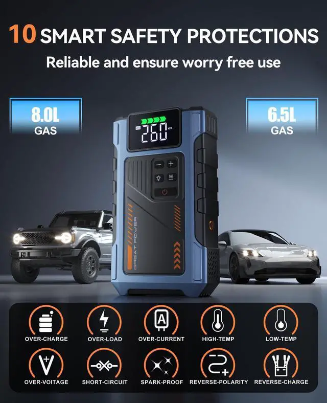portable air compressor and jump starter with a maximum current of 4500 A. It is a jump starter power pack for a 12V car battery with a 150 PSI tire inflator. The jump-starting battery pack has 10 safety features to protect your devices, including overcharge, overcurrent, short circuit, reverse polarity, low temperature, high temperature, overvoltage, overload, spark proof, and reverse charge to provide a longer service life.Engine compatibility: 8.5L gas/7.0L diesel.