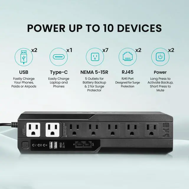 Seven outlets allow flexible device connection, with five battery backup outlets and two surge-protection-only outlets. Integrated USB and Type-C charging ports provide convenient charging for phones, accessories, and small electronics without occupying standard outlets, supporting modern smart home and workspace needs.