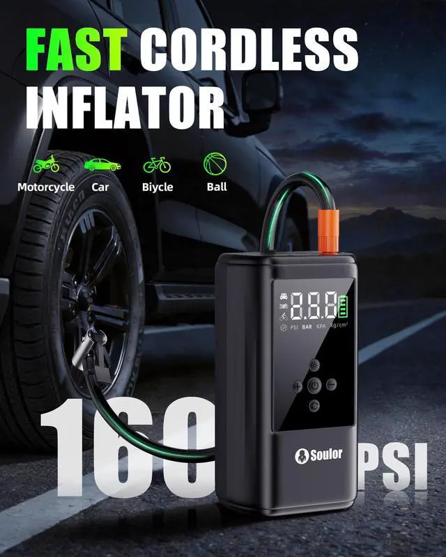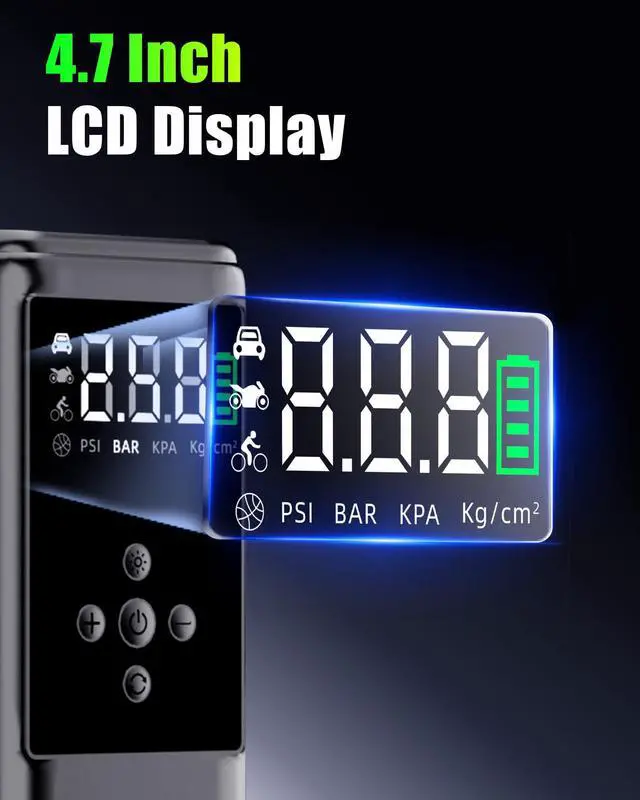 160PSI CORDLESS INFLATOR & 4.7" SMART DISPLAY: Our car starter features 5 inflation modes (up to 160 PSI), 4 selectable units, and 3 nozzles, making it versatile for cars, motorcycles, bicycles, balls, and more. The auto memory function supports one-touch repeated inflation, and the 4.7-inch LCD display on the battery jump box shows real-time data with an accuracy of ±1 PSI.