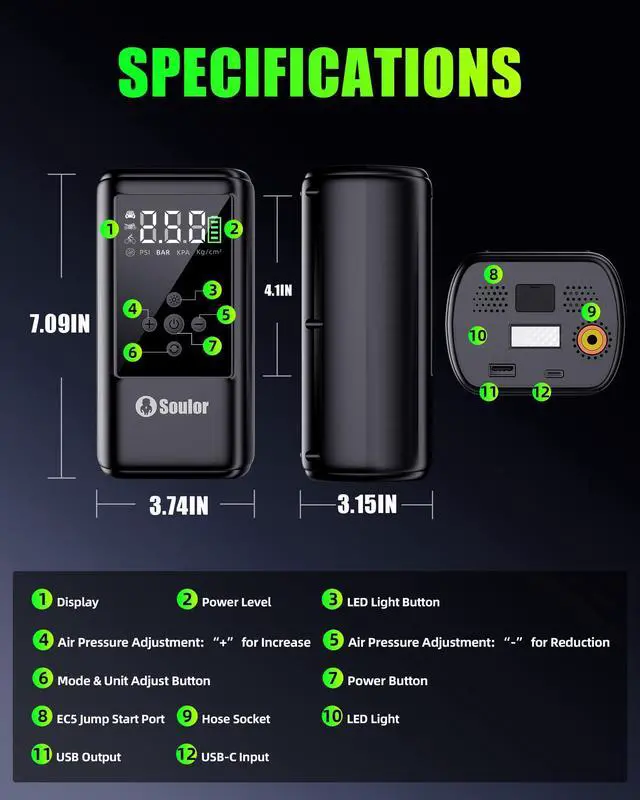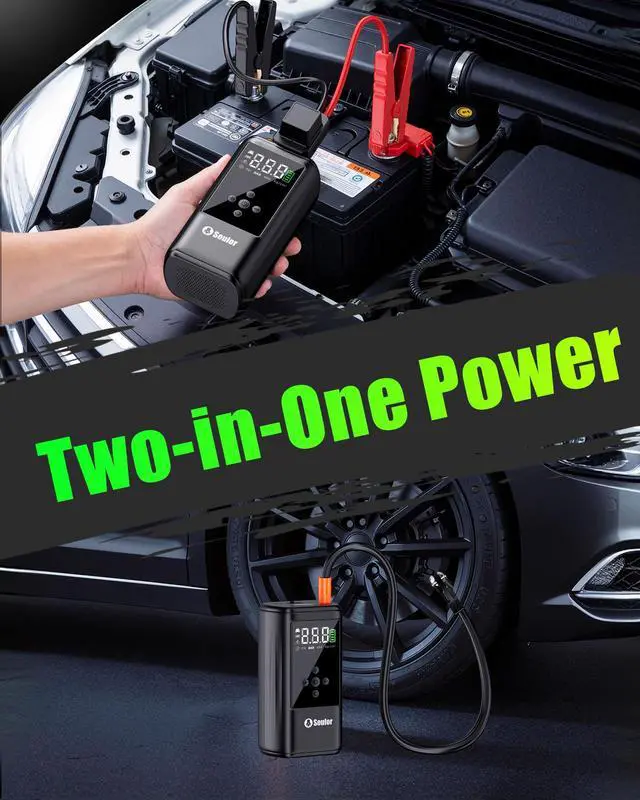 10-IN-1 ALL-IN-ONE CAR BATTERY JUMPER: This is a car jumper starter portable, a 5-in-1 wireless tire pump, portable power bank, PD45W fast charger, with three-mode light (flashlight, strobe, SOS). The battery jump pack is portable and multifunctional, making it an essential professional travel kit for outdoor or emergency situations. The portable car jump starter provides drivers and outdoor enthusiasts with multiple solutions.