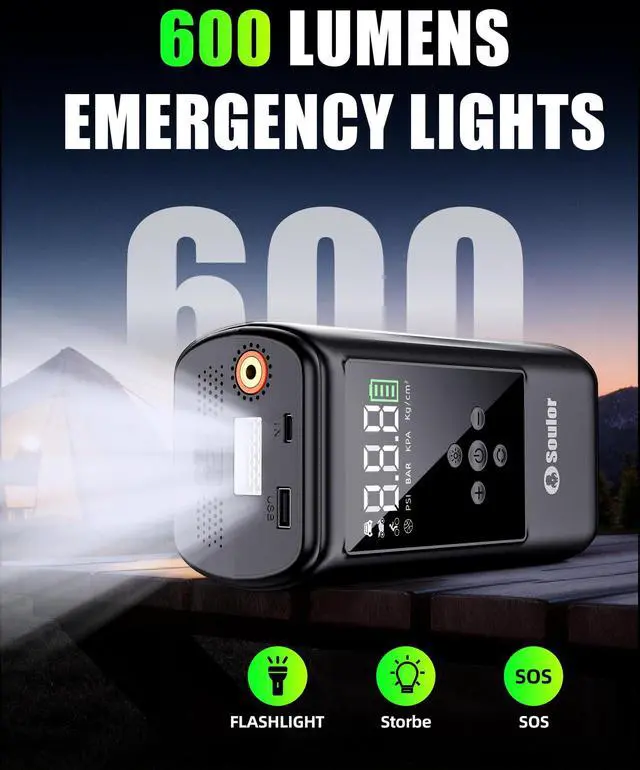 EMERGENCY 600LUM LIGHTS: The jump starter power pack is featured with 600 lumens providing 3-mode (flashlight, strobe, sos) lights for different cases.