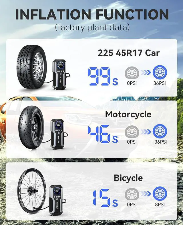 150 PSI TIRE INFLATION FUNCTION: Beyond its jump-starting capabilities, this device includes a high-performance air compressor for inflating tires with precision. 5 inflation modes (MAX 150PSI, with auto parameter memorization), 4 optional units, and 4 nozzles for wide applications (cars, motorcycles, bikes, balls, etc). The real-time pressure display helps maintain optimal tire pressure for safer driving.
