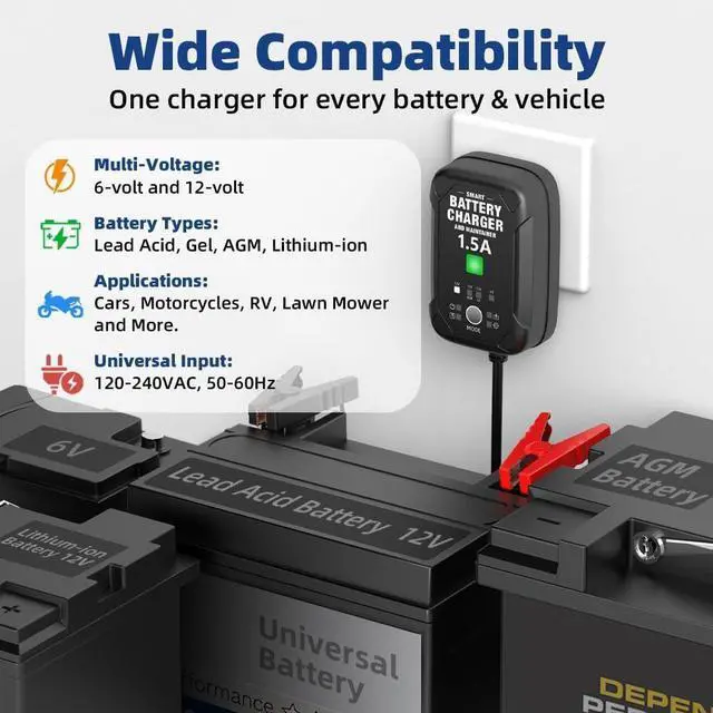 1.5A 6V/12V Car Battery Charger Automatic Trickle Charger, Battery Maintainer with Overcharge Protection & Temperature Compensation for Lead Acid, AGM, Gel, Lithium Batteries