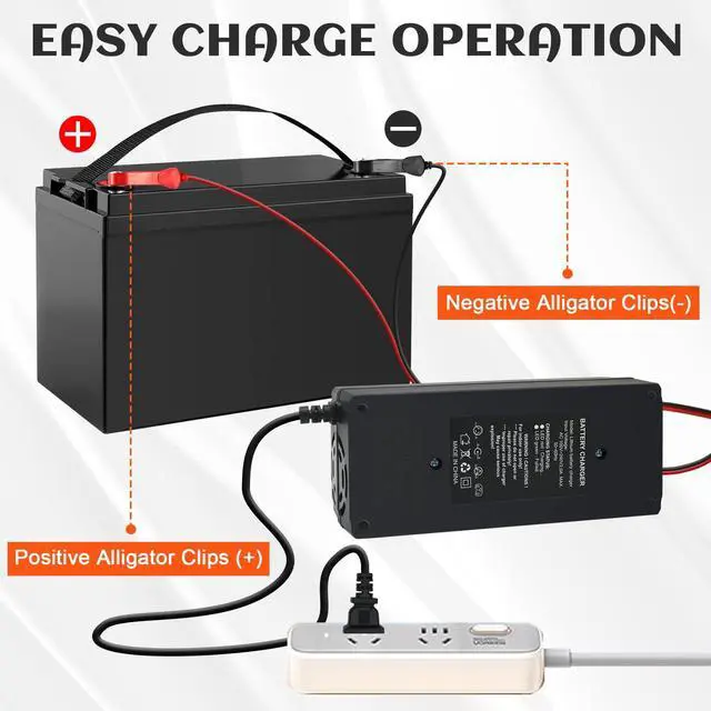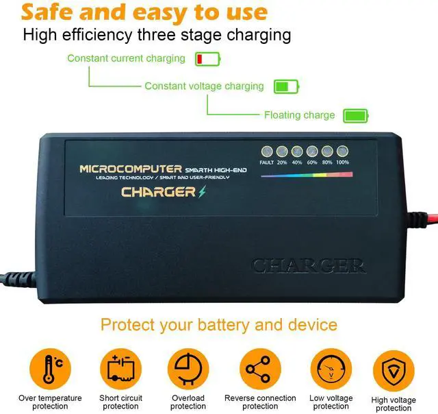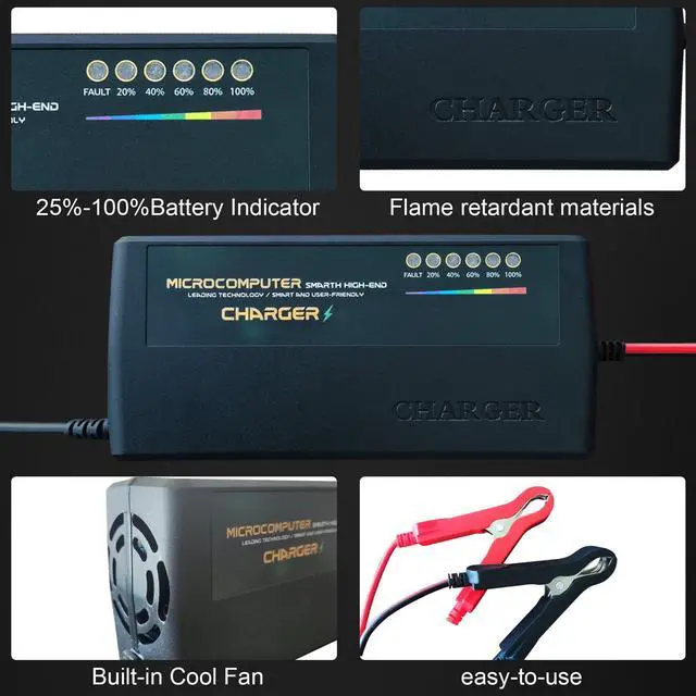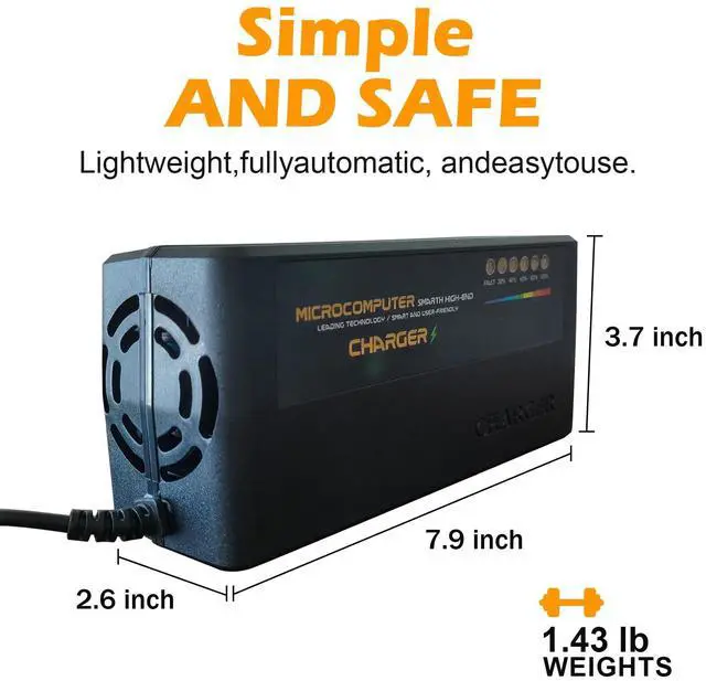 This 48v lifepo4 charger equipped with advanced microprocessor technology.automatically detects the battery status and adjusts the charging rate accordingly. Featuring 6 LED indicator light disply that shows the battery status 20%-100% and indicate fault alarm,alligator clip output easy and simple.