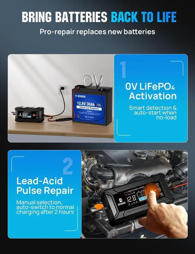 0V LiFePO4 Activation: Built-in 0V activation technology lets the DC HOUSE 12V lithium battery charger automatically revive deeply discharged LiFePO4 batteries, restoring stable voltage for consistent, dependable power output