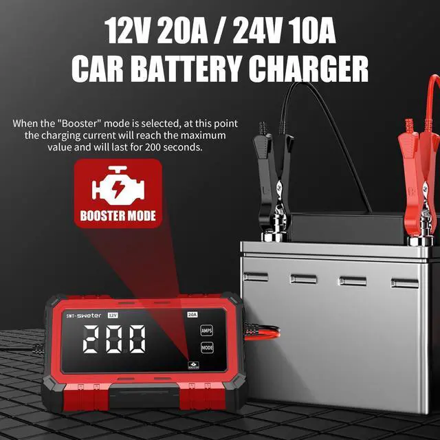 20A Smart Car Battery Charger & 12V/24V Maintainer with 200s Booster - Compatible with 12.6V Lithium-Ion (NMC), LiFePO4, AGM, Gel, Lead-Acid, Truck, Motorcycle, RV, Boat