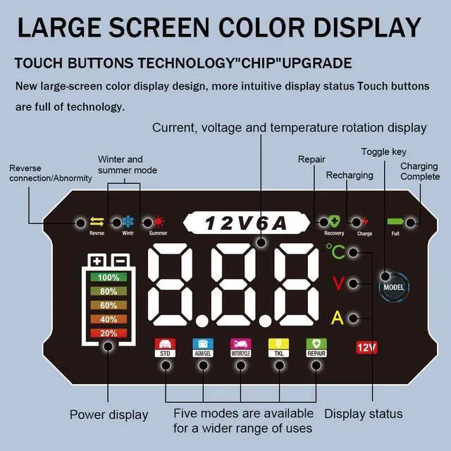 • Winter/Summer Mode Voltage-Split Charging - The charger automatically detects ambient temperature and activates winter/summer modes, providing optimal temperature selection and adaptive charging voltage (no manual adjustment required).