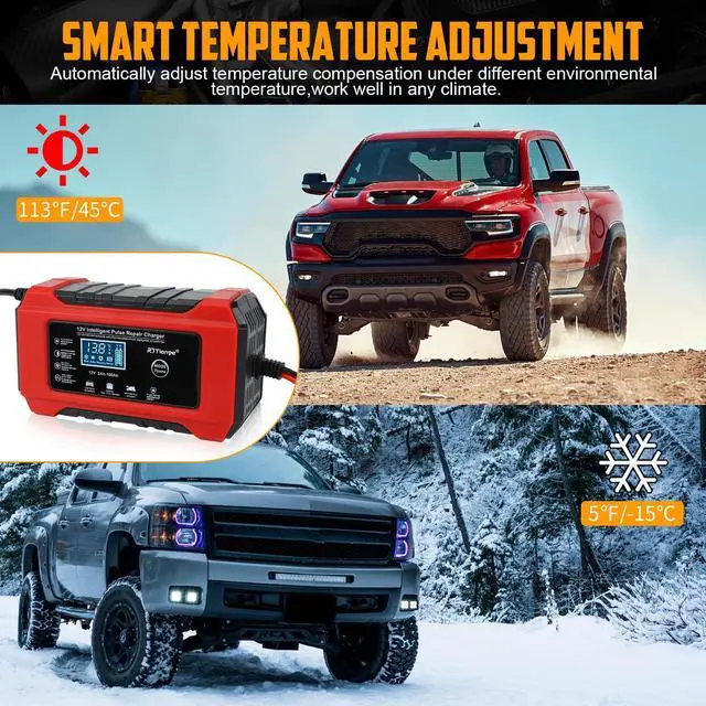 Multiple Safety ProtectionFeatures winter and summer modes,smart control,adapt to temperature changes and adjust the charging rate,preventing battery drain.It offers multiple protections,circuit protection guards against reverse polarity,sparks, overcharging,over-current,open-circuits,short-circuits and overheating,stable performance for longer life.