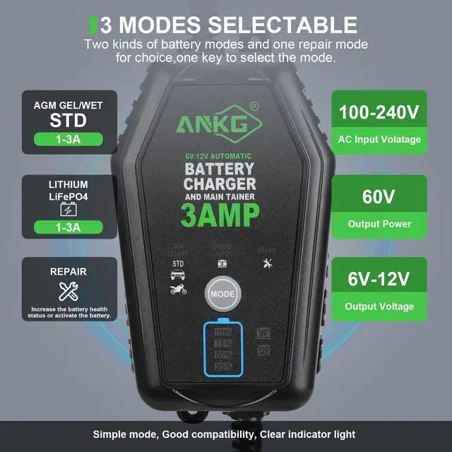 Intelligent & Automatic Charging Equipped with smart charging technology, this battery charger automatically detects voltage and adjusts the charging current to match your battery type. It delivers a full charge and switches to float mode to prevent overcharging, ensuring your battery is always ready for use without the risk of damage.