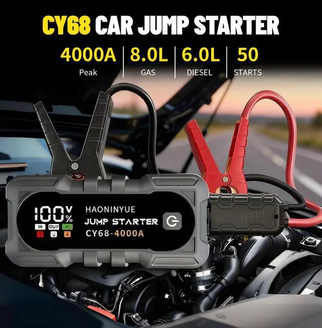 CY68 4000A Car Battery Jumper Starter,12V Portable car Jump Starter,Power Bank with Jumper Cables,Jumper Box with USB Ports LED Light,Suitable for 8.0L Gasoline Engines and 6.0L Diesel Engines