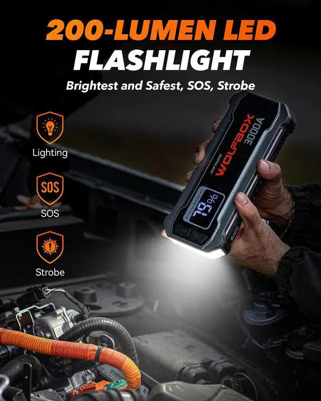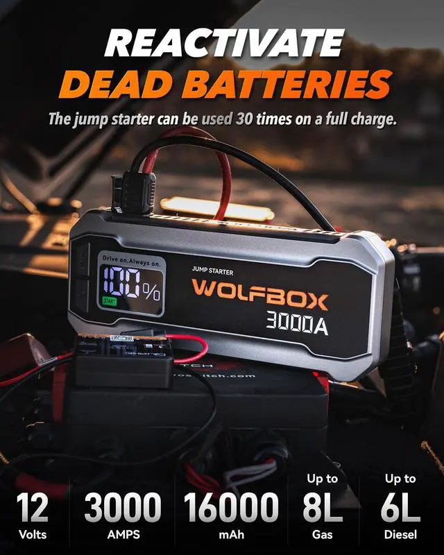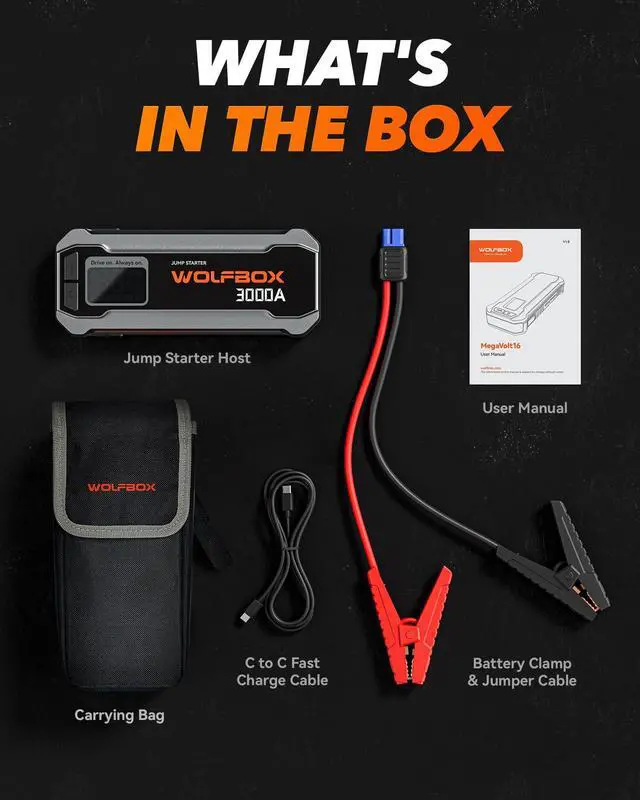 Elevate Your Drive with forHigh-Tech, Rugged, Stylish Road Safety.High-capacity 3000A Jump Starter - This car battery jump starter With a robust 16000mAh battery, it is ideal for 12V vehicles, including cars, trucks, boats, and larger vehicles. It can quickly revive dead batteries in emergencies, whether you have a gasoline car under 10L or a diesel vehicle at home.65W USB-C Quick Charging - We have 1 * 65W Type-C in/out port,1 * QC3.0 USB-A port, The jump start battery pack source fully charges in just one hour. With two output ports, it quickly charges common electronic devices like phones, laptops, iPads, making it ideal for travel or campingBooster & LED Flashlight - The booster function can assist you in starting your vehicle normally when the voltage is too low, and this jump box supply also comes equipped with an LED flashlight featuring SOS, strobe, and high-beam modes.In emergency situations, it can serve as your emergency deviceHD LED Display - This LED screen provides a clear display of all the status indicators for the portable car jump starter supply. You can easily discern the current state of your emergency power source, facilitating seamless access to all functionalitiesIP64 & 10 Types Protections - The battery jumper starter portable with an IP64 protection rating, ensures the emergency power supply is resilient in harsh environments.Internally, it features 10 essential safety protections,including spark-proof, low-temperature protection, and high-temperature protection24 Months Warranty & Customer Services - The battery jumper starter portable comes with a 24-month warranty, software upgrades, and 24/7 customer service. During this period, we will resolve any issues related to the product, installation, or usage for you.