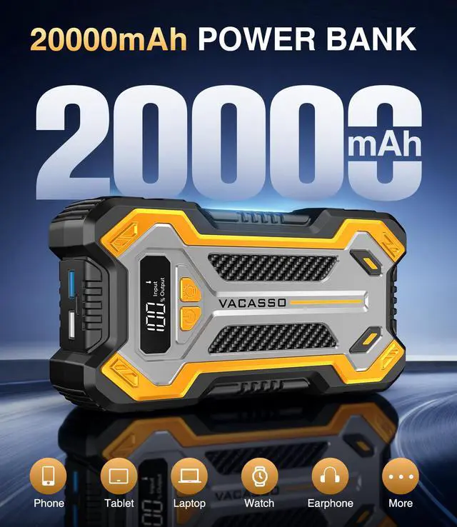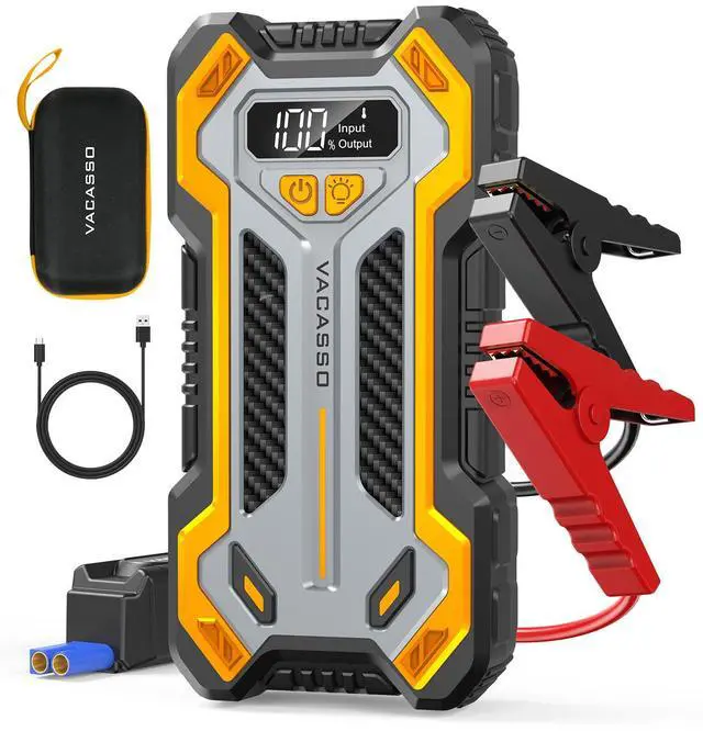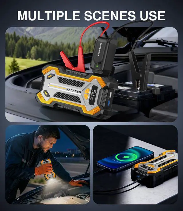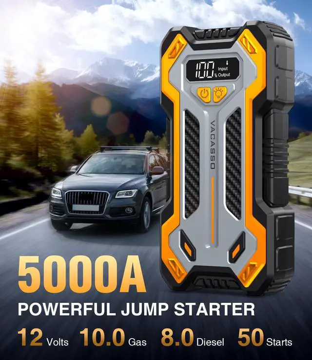 Powerful Car Jump StarterVACASSO Jump Starter provides excellent 5000A peak current, quickly jump starts a dead battery in seconds, and ensures safe connection to all 12V vehicles (10L gasoline/8L diesel), can start cars, motorcycles, SUVs, pickups, boats, RVs, trucks, vans, tractors, etc. This Z08 battery jump starter portable can be started up to 50 times per charge.