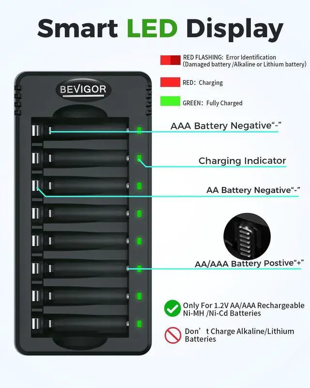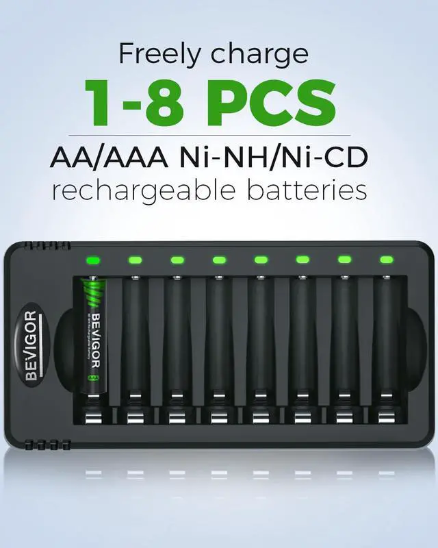 Smart Charge Uses smart chip technology to safely switch to trickle charge near full capacity, preventing overcharging, overheating, or damage to NiMH batteries.