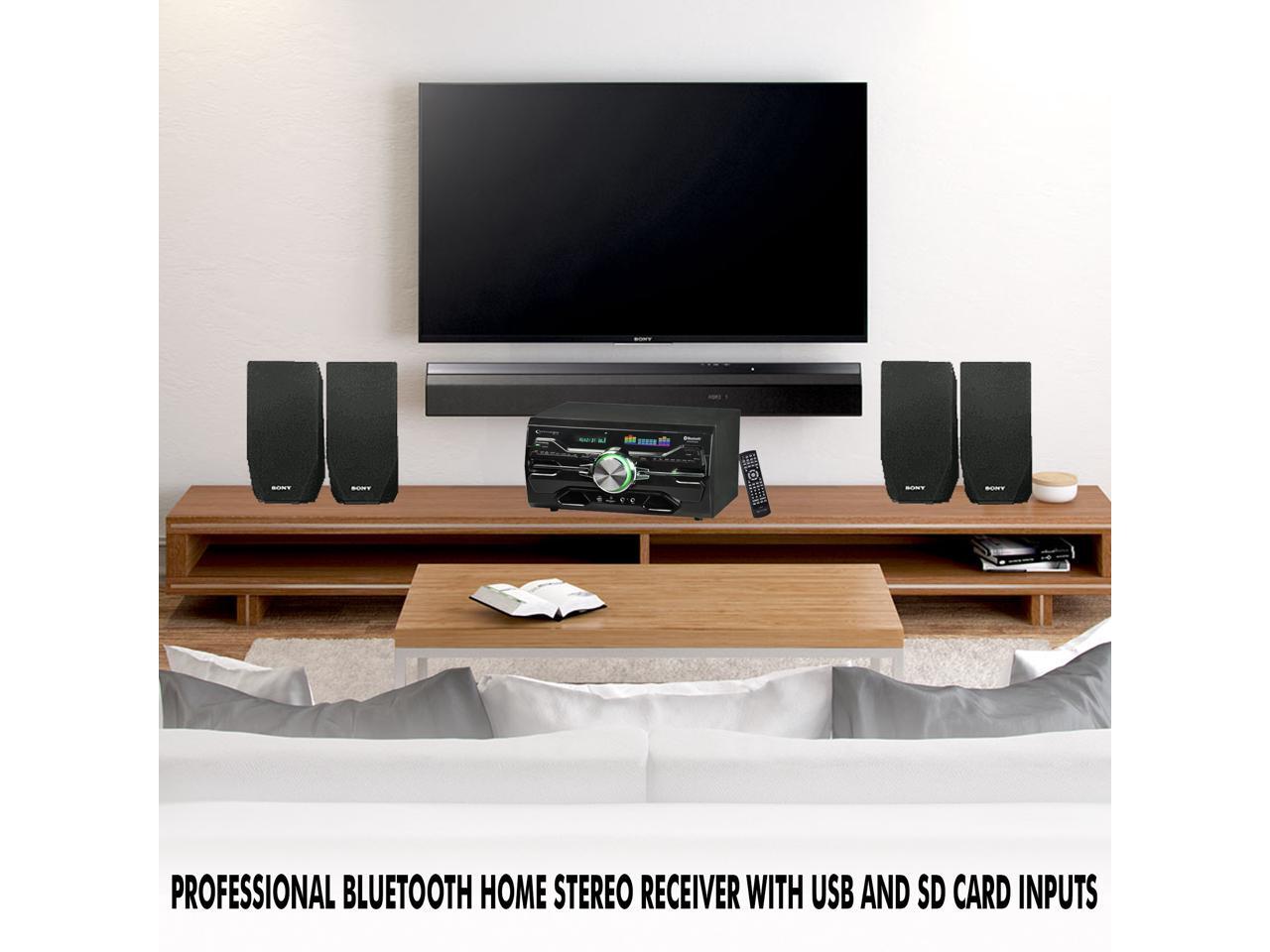 - Features: - 10,000 watts peak power - Inputs: RCA, USB, SD Card, Bluetooth, Optical - Audio outputs: Optical, AUX - Video outputs: HDMI, RCA, YUV, RGB - Remote included