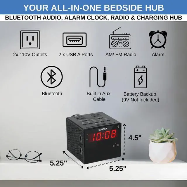 This charging station clock radio includes two 110V AC outlets and two USB-A charging ports (1A and 3.1A) so you can power lamps and charge phones, tablets, and other small devices directly from your nightstand. It also works well as a desk charging station, helping reduce the need for extra wall adapters or power strips.
