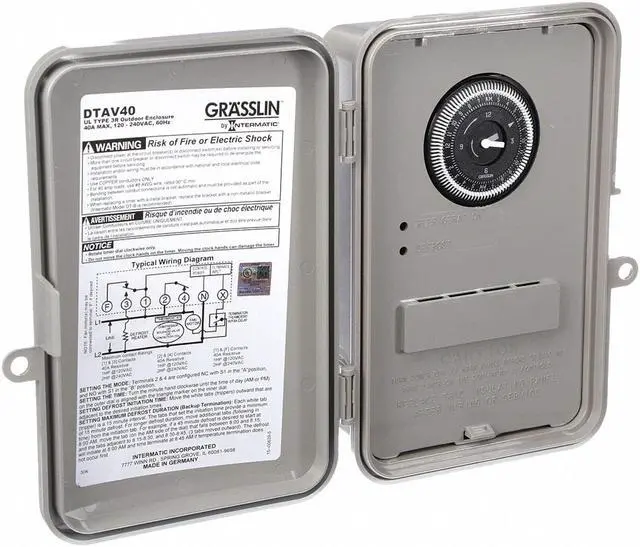For electric heat, hot gas or compressor shutdown defrost. The Grsslin DTAV40 Series Auto Voltage Defrost Timer is applicable to air defrost (compressor shutdown) and electric or hot gas defrost systems where the defrost cycle is terminated by the timer. If the coil is frost-free, the timer can also be terminated by temperature or pressure switches before the programmed defrost termination time has been reached. The time termination functions as a fail-safe and terminates the defrost cycle if the temperature or pressure switch fails to do so.