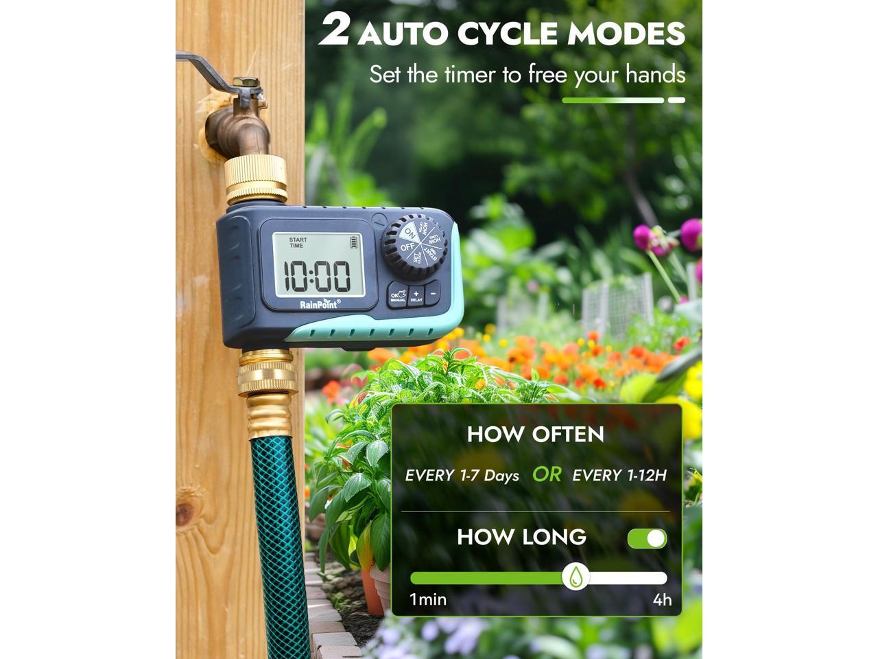 - Easy Programming Program: Through the Sprinkler Timer program, you can set the Start Time, Watering Duration is 1min-3h59min, Watering Frequency from 1h to 12h or 1 day to 7 days. So you can customize watering duration and frequency for more efficient irrigation, saving you money on water bills.