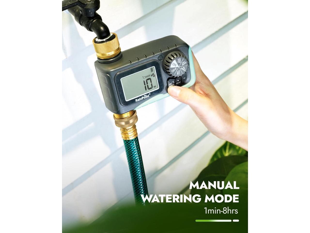 - Rain Delay & Manual Mode: With rain delay mode, your programmed schedule will be paused for 24, 48, or 72 hours, and will be automatically resumed. Using manual mode, any lawn or garden can be watered as needed, with customizable times from 1 min to 8 hrs, and without interrupting your schedule.