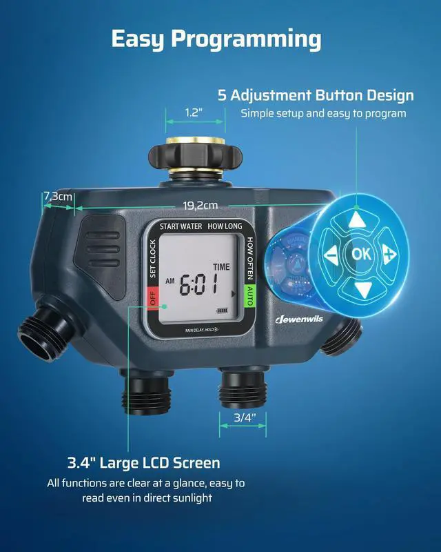 [User-friendly] Featuring a 3.4-inch LCD screen, this faucet timer offers a simple and intuitive user interface; all functions are clearly displayed with accompanying explanatory text on the left, providing comprehensive details; the flashing cursor on the screen and 5 program buttons enable users to effortlessly achieve various watering cycles