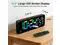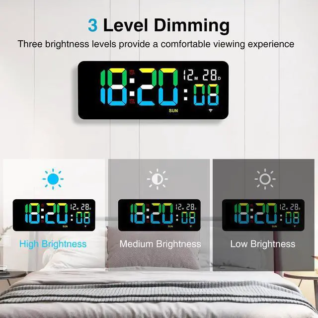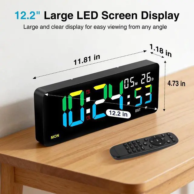The alarm clock has a diagonal length of 12.2 inches. Its width is 11.8 inches, and its height is 4.7 inches. The digital display measures up to 9 inches.