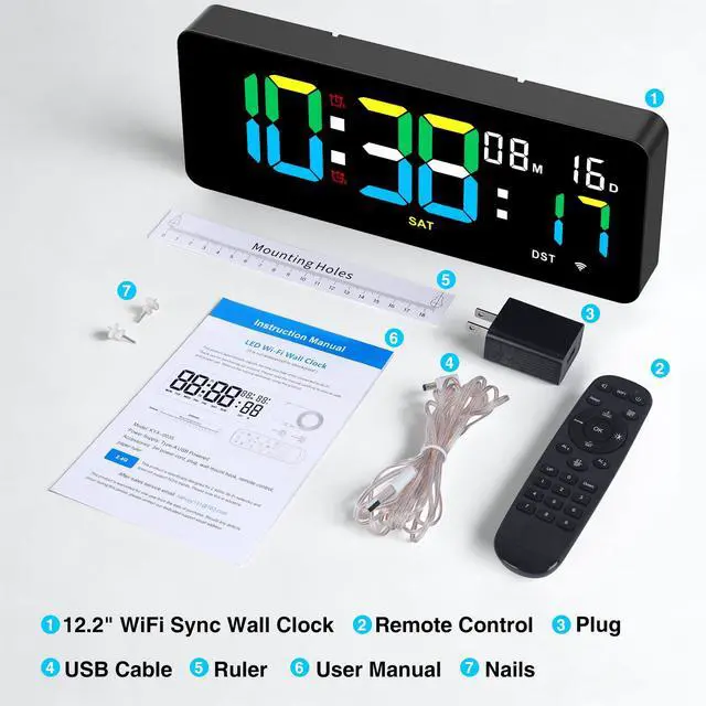 This LED wall clock has two holes spaced 3.3 inches apart on the back, allowing you to hang it on the wall with nails.