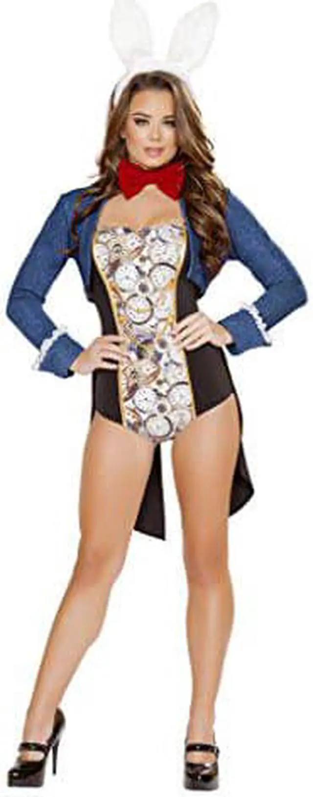 Youll be right on time in this Jittery Rabbit costume featuring a black romper with a clock patterned design, a gold trim, gold button accents, draping coattails, a blue bolero jacket with long sleeves, ruffled cuffs, a red bow tie, and a white ears headband.