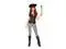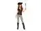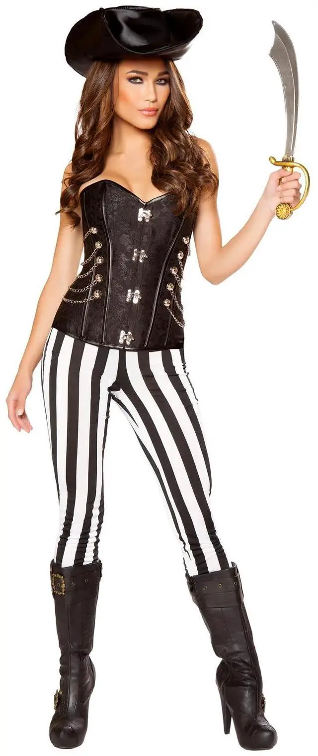 Set sail in this Seven Seas Hottie costume featuring a black corset with a front hook closure, chain accents, piping details, a lace-up back closure, black and white striped pants, and a toy sword. (Hat not included.)