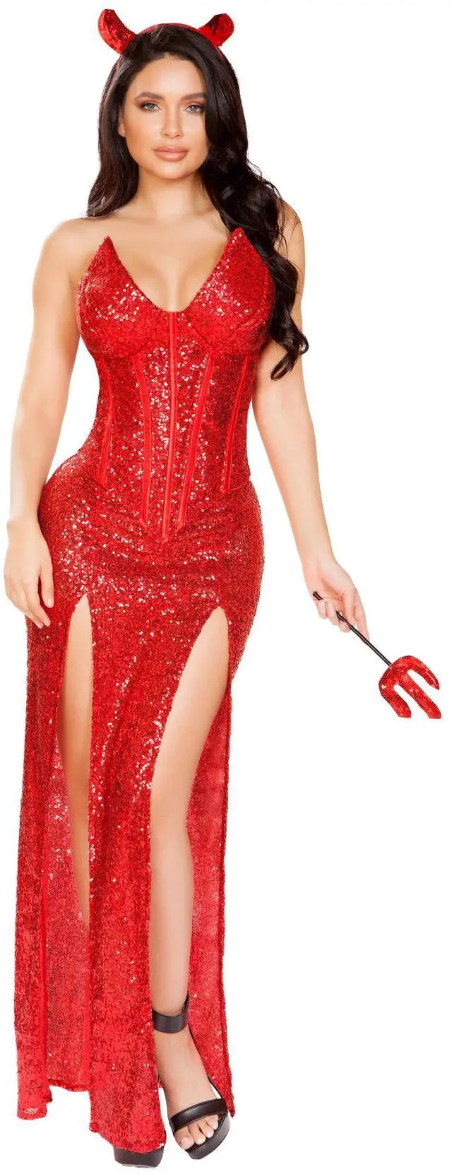 Flame the fire of satan and desire! Being bad looks oh so good in this Red Hot Devil costume featuring a red sequin corset with shaped, padded cups, a front zipper closure, and lace-up satin ties, a long sequin skirt with side slits and a front panel, and a sequin horn headpiece. (Pitch fork not included. )