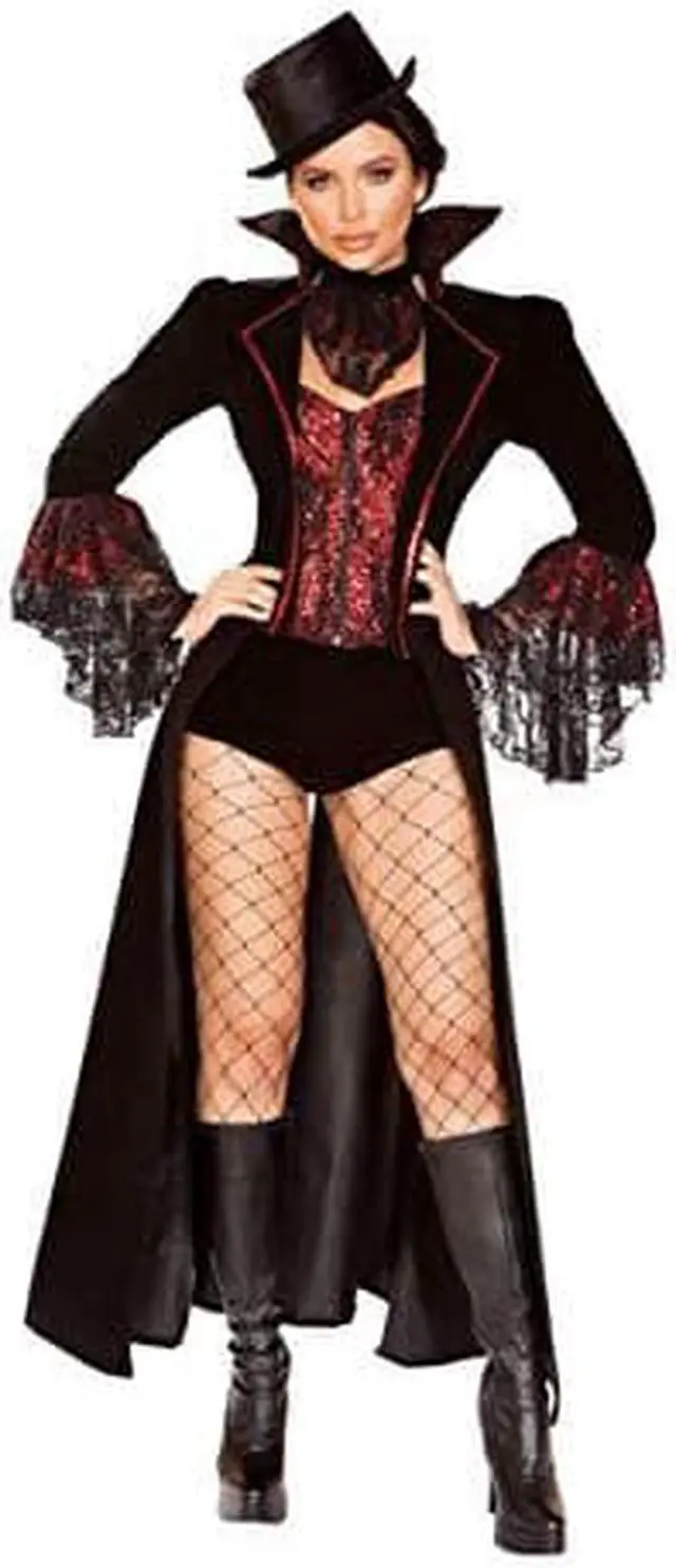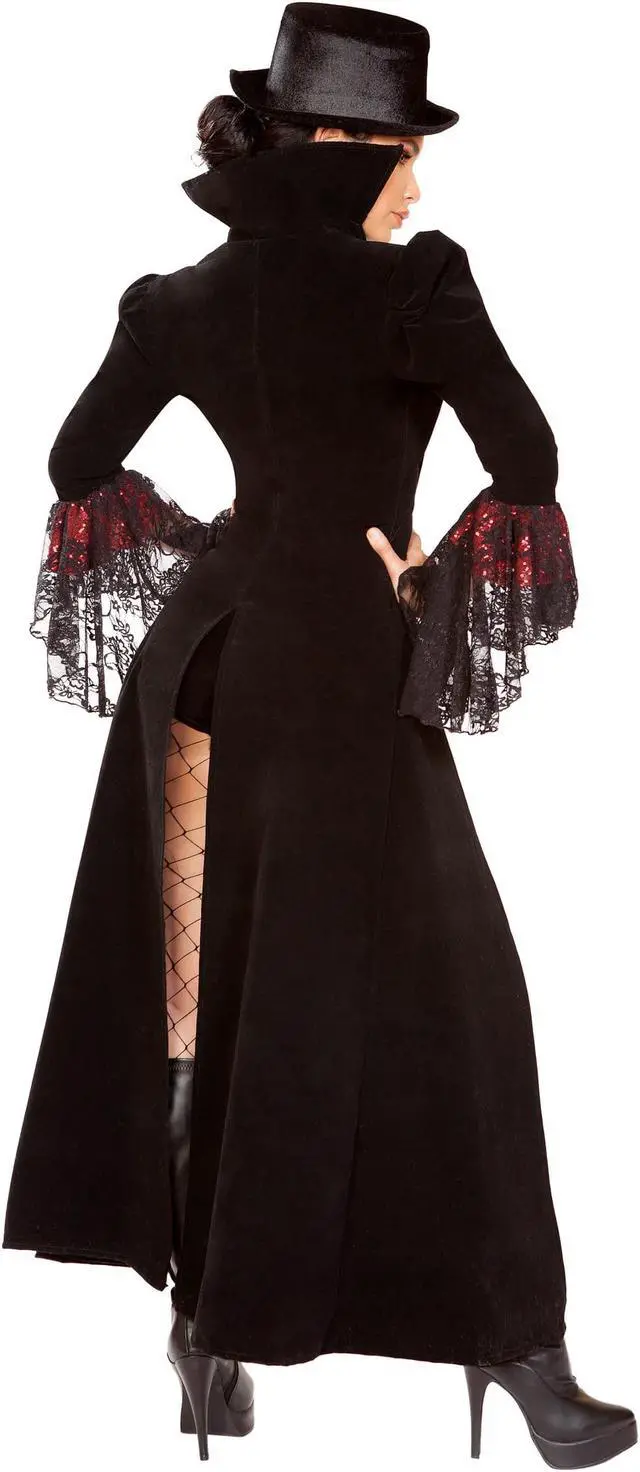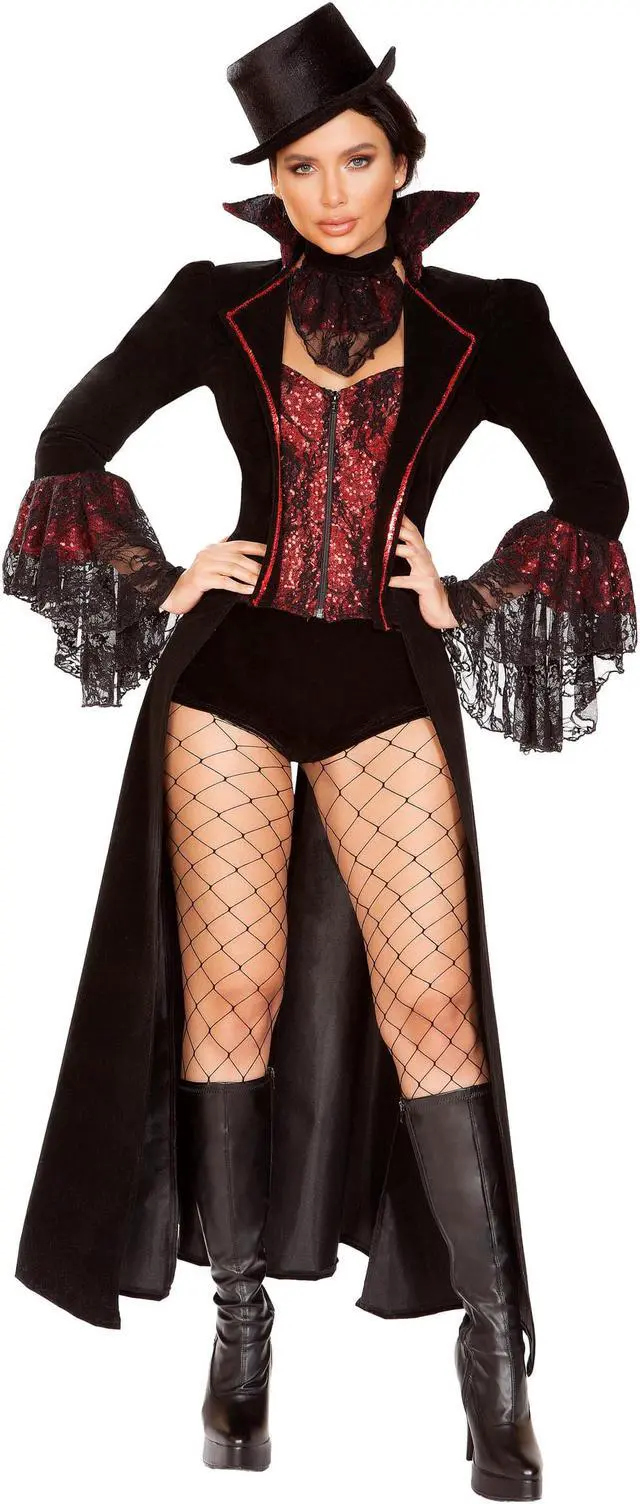 If looks could kill, youd be knocking everyone dead! Go for their blood in this Lusty Lace Vampire costume featuring a sequin corset with a sweetheart neckline, a front zipper closure, an attached long coat with lace flair sleeves, red trim detail, and a high collar, a sheer lace neckpiece, matching shorts, and a top hat. (Fishnet stockings not included. )