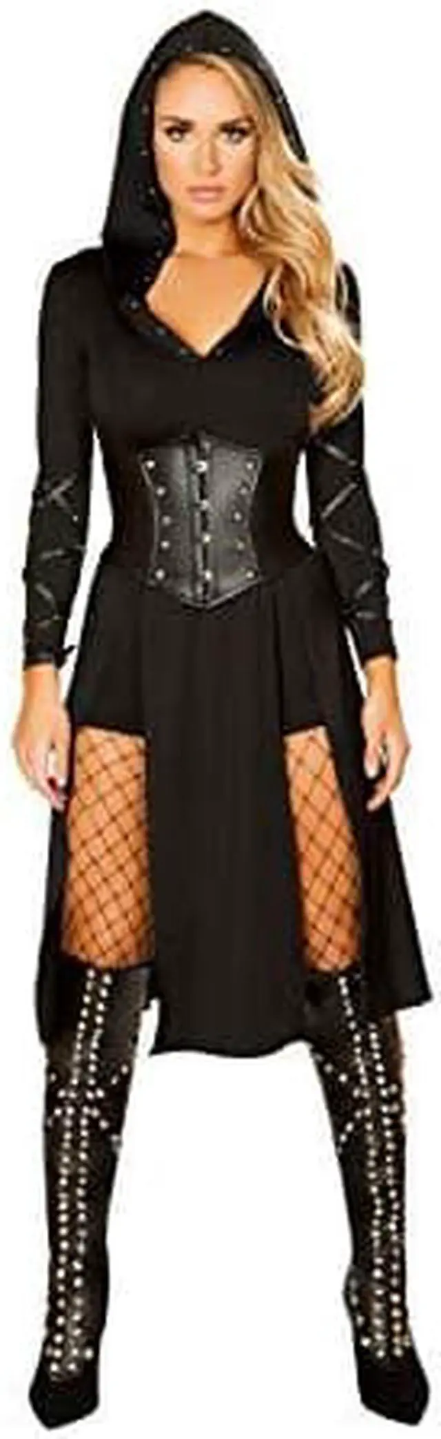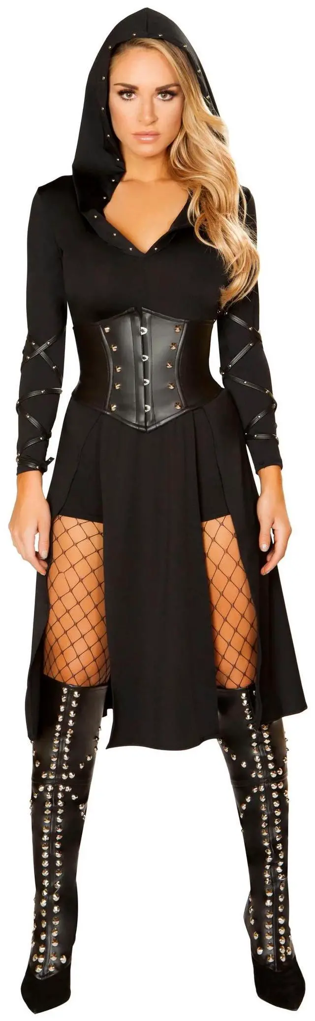 Protect yourself at all costs. Take down your enemies in this Queens Assassin costume featuring a black dress with a V-neckline, long sleeves with studded arm wraps, an attached hood with a studded trim, a long skirt with high front slits, a vinyl wait cincher with a front hook closure, stud accents, a lace-up back closure, and matching shorts. (Pantyhose, swords and leg warmers not included. )