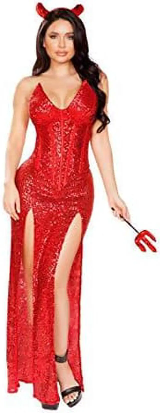 Flame the fire of satan and desire! Being bad looks oh so good in this Red Hot Devil costume featuring a red sequin corset with shaped, padded cups, a front zipper closure, and lace-up satin ties, a long sequin skirt with side slits and a front panel, and a sequin horn headpiece. (Pitch fork not included. )
