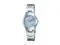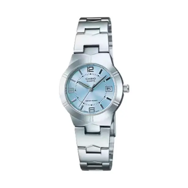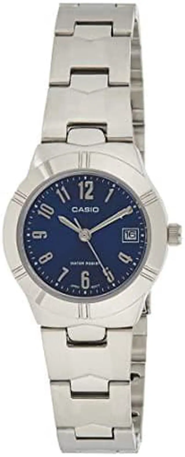 This Casio Womens Analog Display Quartz Watch has a round stainless steel Silver case, an analog display and a stainless steel Silver band. The case size of this quartz movement watch is 27mm while its thickness is 9mm. It has an accuracy of +-20seconds a month and a battery life of 3 years. The watch has a water resistance of 50meters (5ATM) and has a fold-over clasp.
