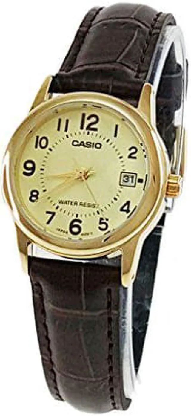 Case / bezel: Gold tone Leather Band Mineral Glass Water Resistant Date display Regular timekeeping Analog: 3 hands (hour, minute, second) Accuracy: ±20 seconds per month Approx. battery life: 3 years on SR626SW