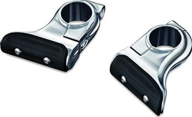 The Kuryakyn 7615 toe rest cruise pegs are the ideal highway pegs with minimalist toe rest mounts. Durable constructed and designed with chrome to match your motorcycle; sized to fit stock engine guards. Attach directly to the engine guard to allow positioning of the operators heel on the floorboard with the front of the foot resting just behind the engine guard; allows for a comfortable cruising option. Includes (2) chrome toe rest cruise peg assemblies, (2) toe kick half, and