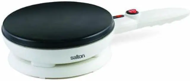 The Salton crepe maker simple set-down and take-off from any position. Cordless central contact. Crepe maker can also fry an egg. Features indicator light and on/off switch, cool touch handles, skid resistant feet, and handy cord storage. Baking area is 7.5 Inches and 800 watts.