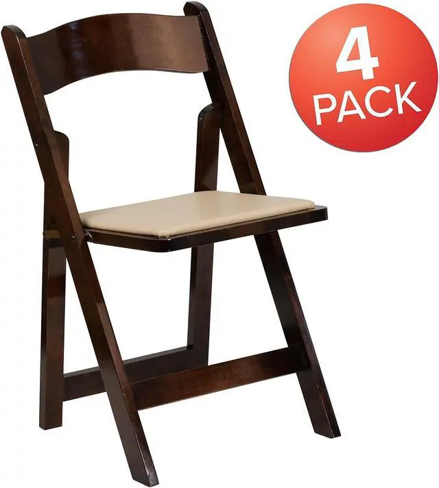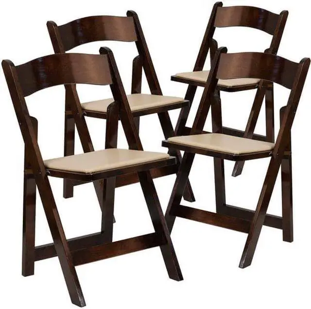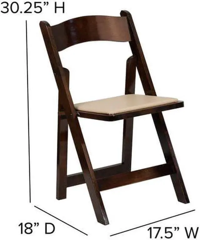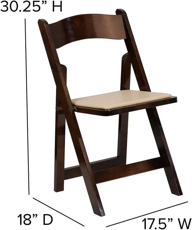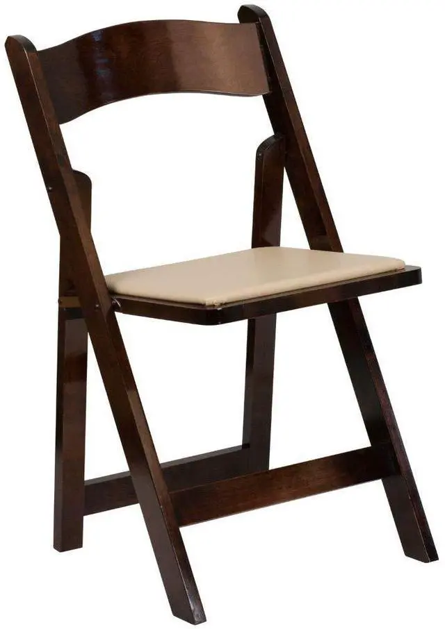 Create a memorable event with this stunning Fruitwood Folding Chair with Vinyl Padded Seat. The chair is constructed of Beechwood that is finished in a clear lacquer varnish. The vinyl padded seat is detachable for easy replacement in heavy use venues. With an easy to clean surface, simply dust off or wipe off the surfaces. This chair has a compact design for easy set up and take down and folds for transport or storage. This wood folding chair is the premier solution for banquet halls, weddings, graduations, and other upscale events.