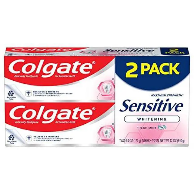 Colgate Sensitive Whitening toothpaste provides 24/7 sensitivity protection with twice-daily brushing. This sensitive teeth toothpaste contains potassium nitrate, clinically proven to soothe the nerves in exposed dentin. With regular use, it provides long-lasting sensitivity relief and removes surface stains to help keep teeth whiter and brighter (with regular brushing vs. non-whitening toothpaste). Plus Colgate Sensitive Whitening toothpaste helps repair weakened enamel, protect teeth from cavities and provides the freshness you trust from Colgate.