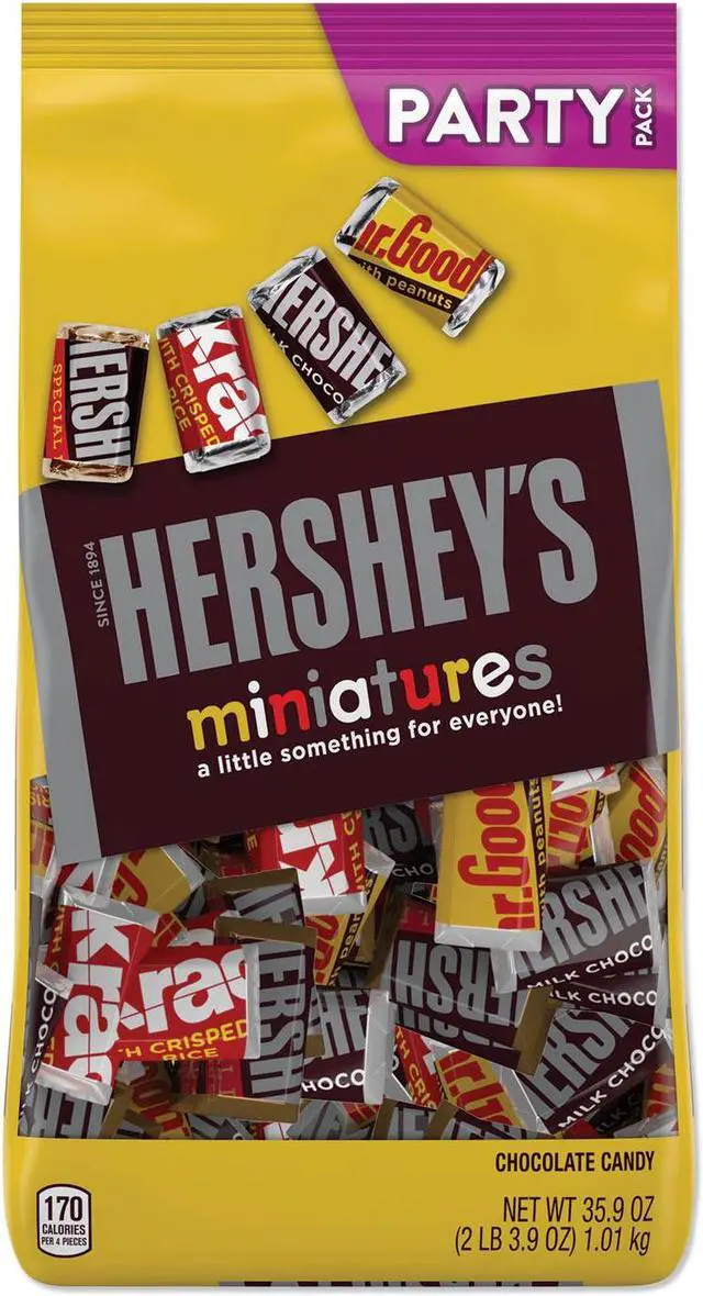 Treat guests with a candy dish full of delicious Hersheys miniatures assortment. Individually wrapped chocolate sweets to satisfy whatever craving strikes. Perfect addition to any dessert table. Food Type: Candy Bars; Flavor: Krackle; Milk Chocolate; Mr. Goodbar; Special Dark; Capacity (Weight): 35.9 oz; Sugar Free: No.