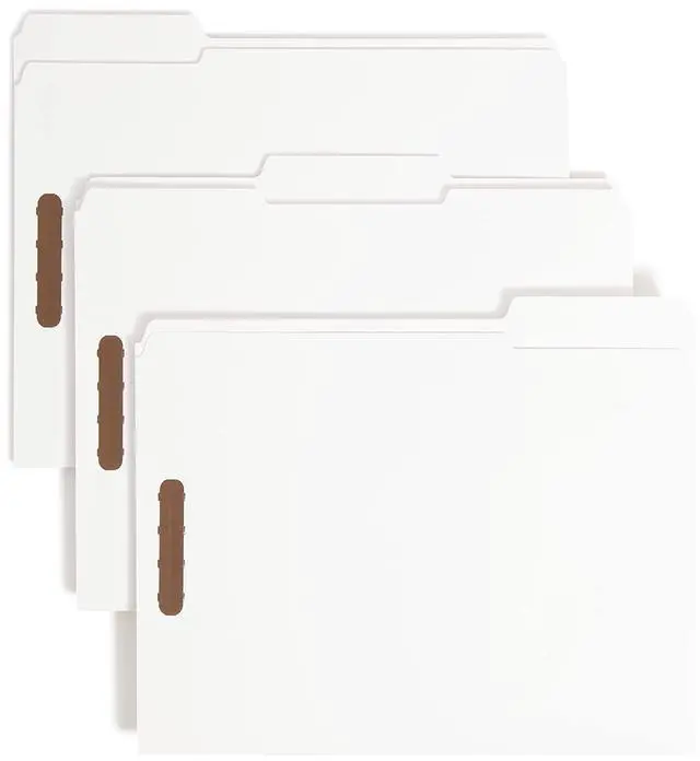 These Smead file folders have fasteners on the front and back panels, creating create two separate filing surfaces Subdivide documents with ease Two 2 prong K style fasteners per folder in positions no 1 and no 3 hold documents securely in place Bright white folders provide a clean, crisp look that will coordinate nicely with other office accessories great for everyday use made of 11 point sturdy paper stock Each folder is scored for 34 Expansion Includes 50 Letter size (11-58 W x 9-12 H) fastener folders Each folder has a reinforced 13-cut tab in assorted positions Proudly made in the USA contains 10% recycled content, 10% post-consumer material and is SFI sourcing certified