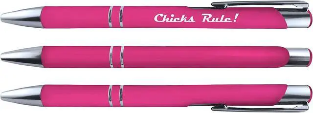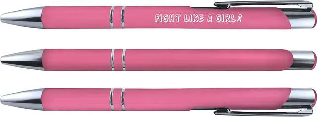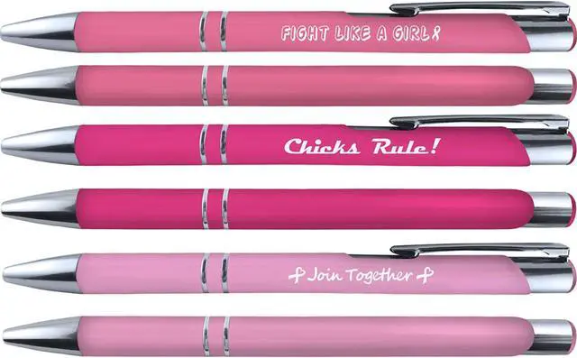 Breast cancer comfort feel Metal pens - 6 pack. These pens have printed messages of encouragement. Soft barrel provides comfortable writing. They also have a Stylus on the end so that they can be used on touch screen devices. Pens are 1mm ballpoint, retractable pen with black ink.