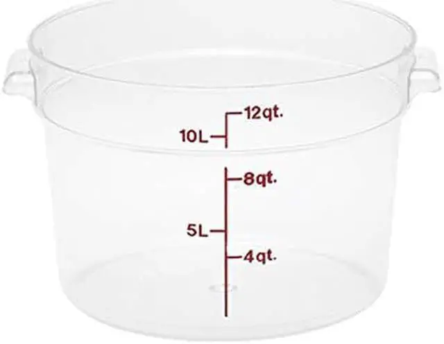 Cambro White Poly Round 12 Qt ContainerMaximize your storage space with this white 12 Qt round container made of impact, stain and chemical-resistant polyethylene. It has easy-to-read graduations on the outside that let you take inventory at a glance, and you can pair this container up with the matching size of snap-on lid to keep things fresh for even longer. This container withstands temperatures from -40°F to 160°F, making it good for both warm and cold food. Good for Warm and Cold Food Impact, Stain & Chemical-Resistant Easy-to-Read Graduations on Outside Molded-In Holes In Handles for Quick & Sanitary Drying Round Shape Promotes Airflow Around