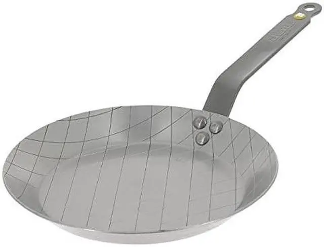 Round rustic carbon steel steak fry pan enhanced non-stick qualities when used for the first time gradual seasoning riveted handle curved in French-style made in France