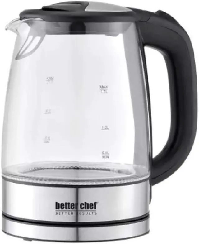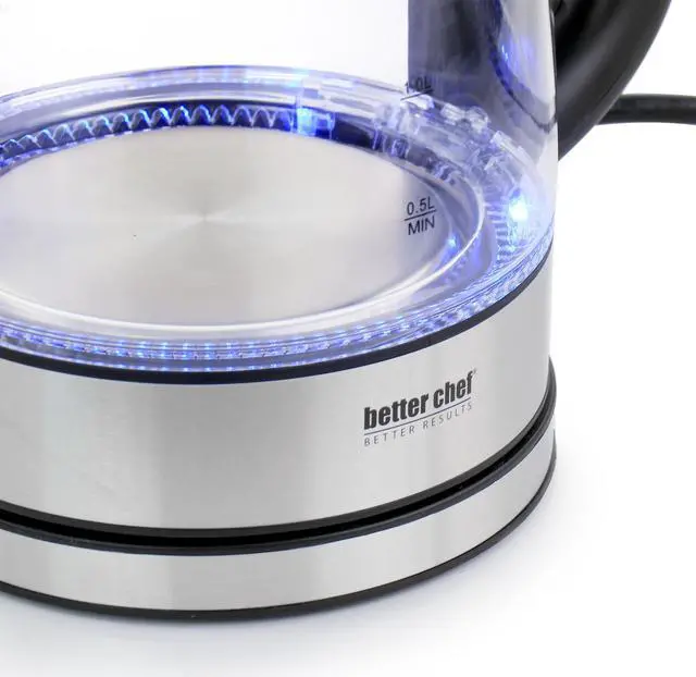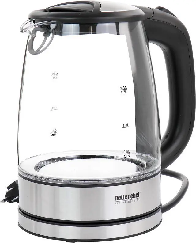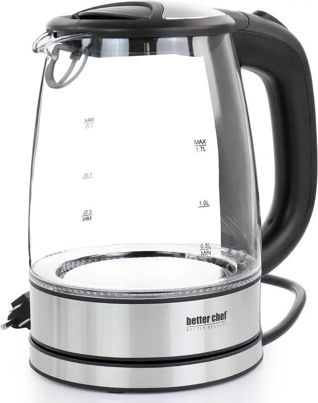 The Better chef 17 Liter 360 Degree glass cordless Electric Kettle is ready to help kick start your mornings This single 7 cup kettle comes in a sleek glass and stainless steel design that will accommodate any kitchen It boils water faster than a standard stove top or microwave With its stain-resistant borosilicate glass, cleanup is a breeze Brighten up your day with the kettles blue LED base