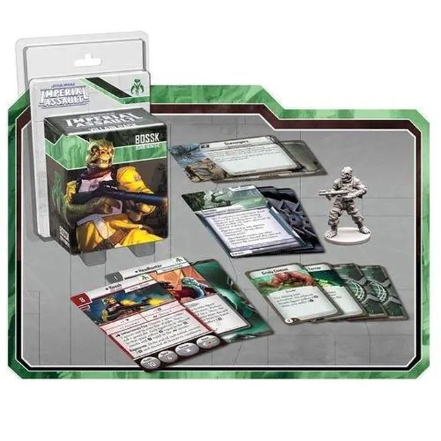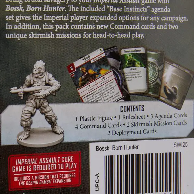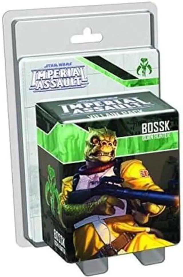 "Take up the hunt with Bossk, a deadly Trandoshan bounty hunter! With this figure pack, you can harness Bossks unbridled ferocity whether you take contracts for the Mercenaries faction in a skirmish or work for the Imperial player in a campaign. With a new Agenda set, Command cards, Deployment cards, a skirmish upgrade, and missions for both campaign and skirmish games, the Bossk Villain Pack is your chance to unleash a bounty hunter and take down your prey. This figure pack includes a sculpted plastic figure of Bossk that you can use to replace the token included in The Bespin Gambit.