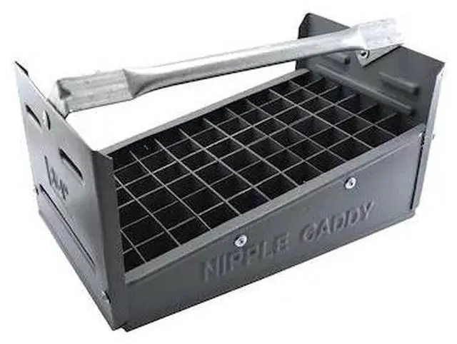Jones Stephens Plastic Nipple Caddy is the organized professionals choice. Our Nipple Caddys feature ightweight and strong plastic construction with weep holes to keep nipples dry. Metal push away foldover handles to allow increased access to the tray for fast time saving work. Our 3/4" Nipple Caddy holds 66 nipples, 3/4" close through 6" in slotted sections right where you need them.