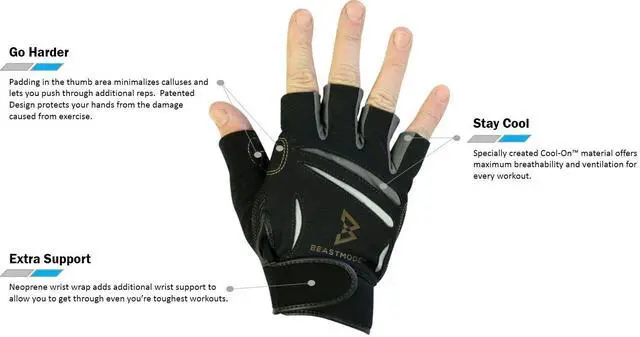 The new premium Beast Mode Fitness Gloves (Beast Mode is The Official Brand of Marshawn Lynch) were designed for fitness enthusiasts and developed by a hand specialist with patented natural fit technology for enhanced comfort, fit and performance. The gloves feature an anatomical pad system and a leather palm for more gripping powerfewer calluses and blisters.