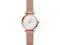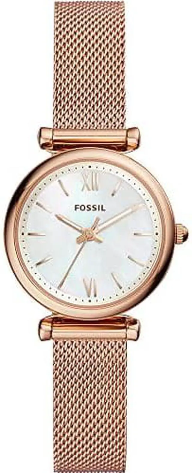Watch Sizing Guide Find a sleek and sophisticated look, perfect for every day, with the Fossil® Carlie watch. Stainless steel case. Rose gold-tone mesh bracelet with fold-over closure. Round face. Three-hand analog display with quartz movement. Mother-of-pearl dial features rose gold-tone hands and hour markers, minute track, and Fossil detailing. Water resistant up to 5 ATM. Imported.