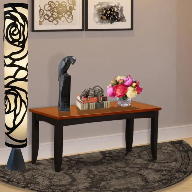 • One Parfait Dining Bench With Wood Seat in Black & Cherry Finish. Constructed with all solid wood. Simple, plain design. Finished in Black & Cherry
