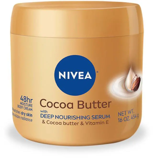 Relax, and pamper your skin with NIVEA Cocoa Butter Body Cream. This rich creamy formula is enriched with our Deep Nourishing Serum, Cocoa Butter and Vitamin E. It delivers intense moisture to dry skin for up to 48 hours, and leaves skin looking radiant and lightly scented after just one application. Treat yourself to a little extra care, you wont regret it! NIVEA Cocoa Butter Body Cream with Deep Nourishing Serum nourishes dry skin for visible radiance. Simply apply this dry skin cream daily to leave skin feeling moisturized and radiant.