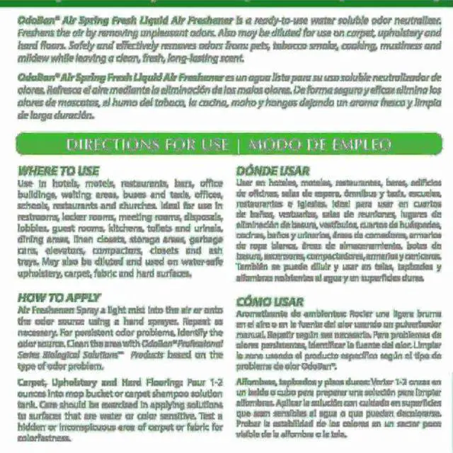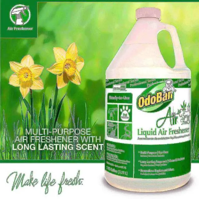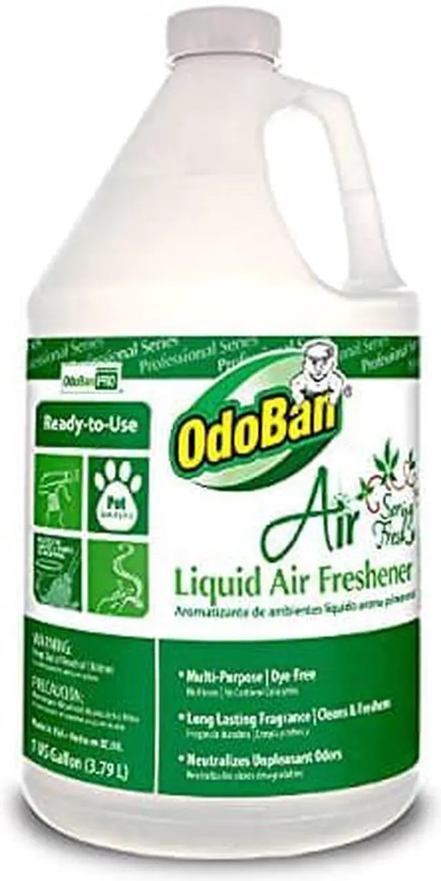 OdoBan Spring Fresh Liquid Air Freshener is a ready-to-use water soluble odor neutralizer. Refreshes the air by removing unpleasant odors. Also may be diluted for use on carpet, upholstery and hard floors. Safely and effectively removes odors from: pets, tobacco smoke, cooking, mustiness and mildew while leaving a clean, fresh, long-lasting scent.